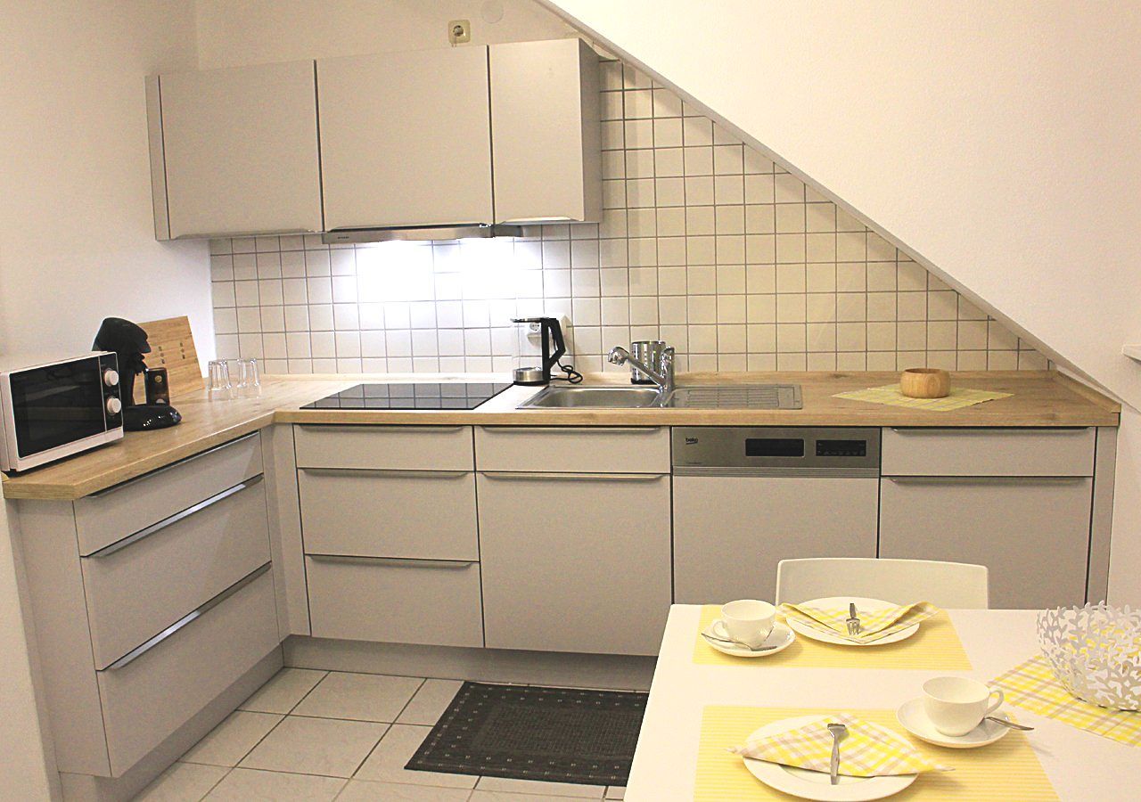 The kitchen is new and offers everything you need for cooking and baking on holiday. It has a four-burner induction hob, an oven at a comfortable working height, dishwasher, fridge-freezer, microwave, Senseo coffee machine with coffee pads, toaster, hand blender and hand mixer, and a kettle. A small basic supply of spices is also available. The dining table can be extended for an extra guest.