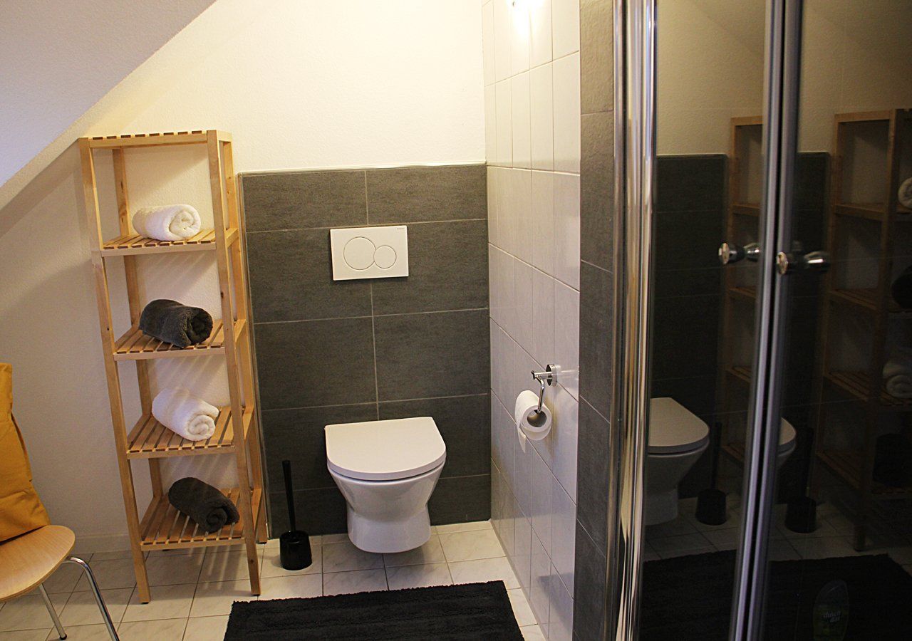 Notre salle de bain est lumineuse et chaleureuse et dispose d'une cabine de douche spacieuse. Il y a un sèche-cheveux puissant et un miroir de maquillage éclairé à fort grossissement. Deux peignoirs moelleux sont également fournis. Des serviettes de toilette et de bain sont également à votre disposition. Cela allège le fardeau de vos bagages.