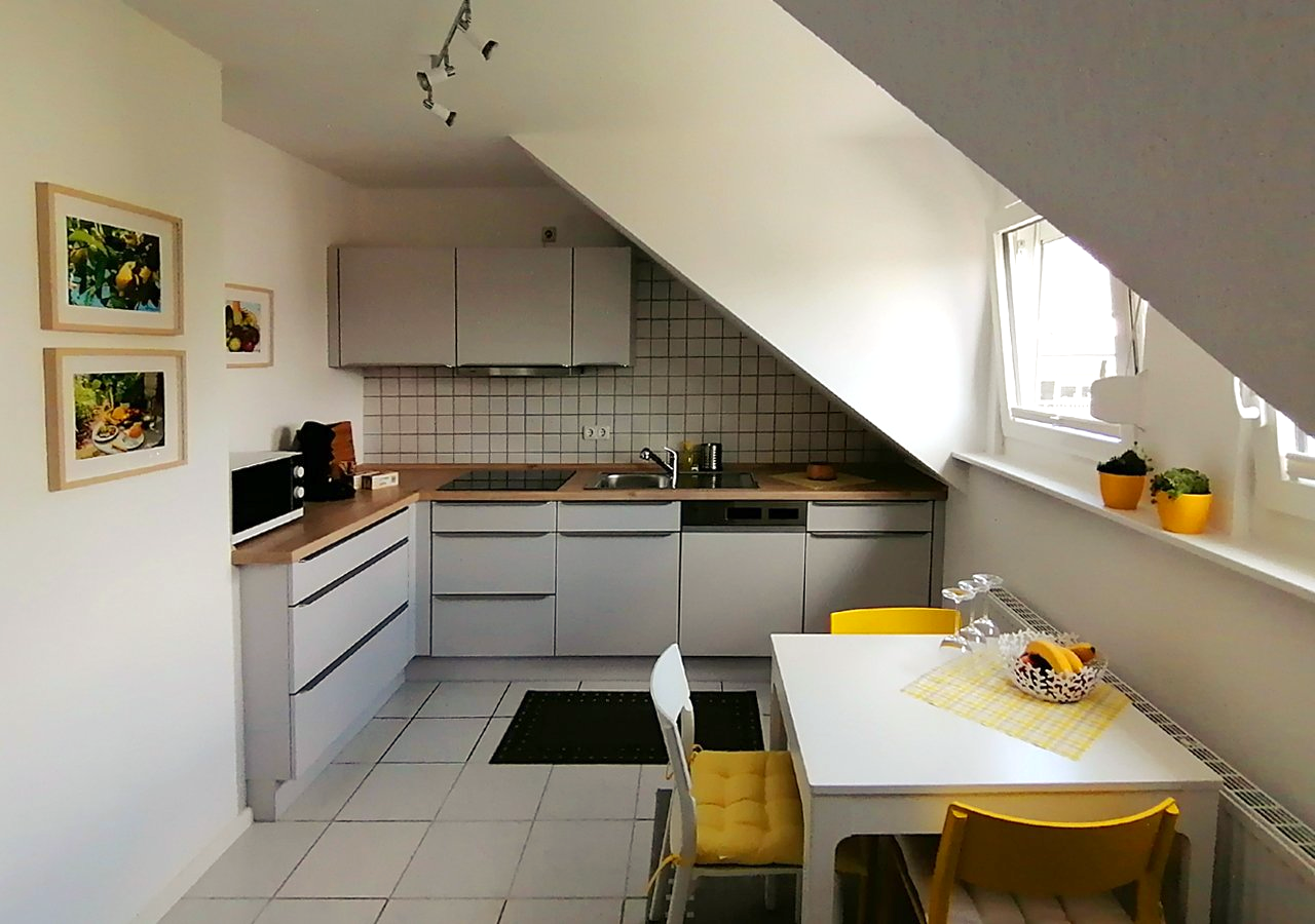 Die Küche ist neu und bietet alles, was man zum Kochen und Backen in den Ferientagen braucht. Sie hat ein Vierplatten-Induktionskochfeld, einen Backofen in bequemer Arbeitshöhe, Spülmaschine, Kühl - Gefrierkombination, Mikrowelle, Senseo-Kaffeemaschine mit Kaffeepads, Toaster, Stab- und Handmixer sowie einen Wasserkocher. Eine kleine Grundausstattung an Gewürzen ist ebenfalls vorhanden. Der Esstisch ist ausziehbar für einen Extra-Gast.